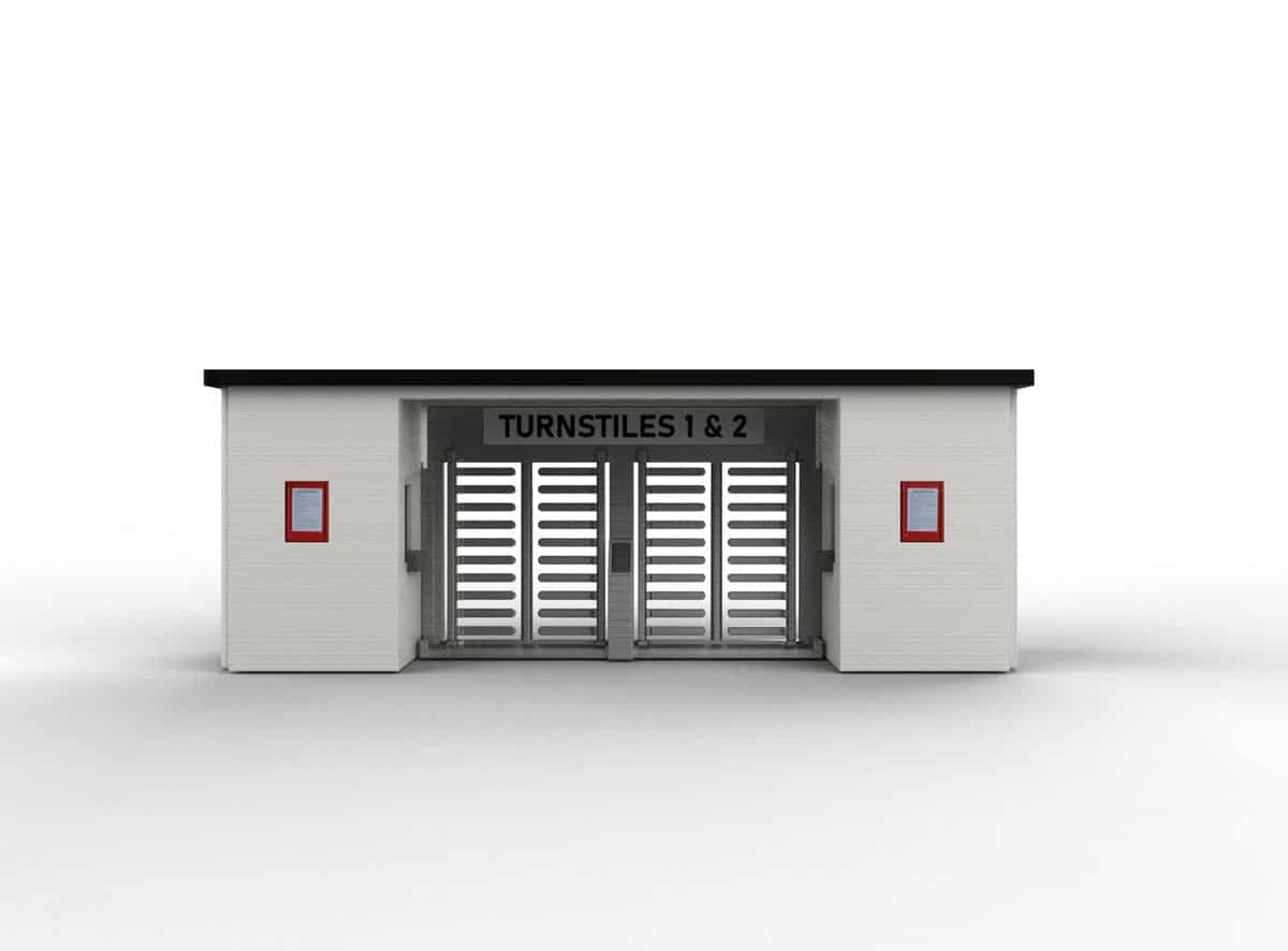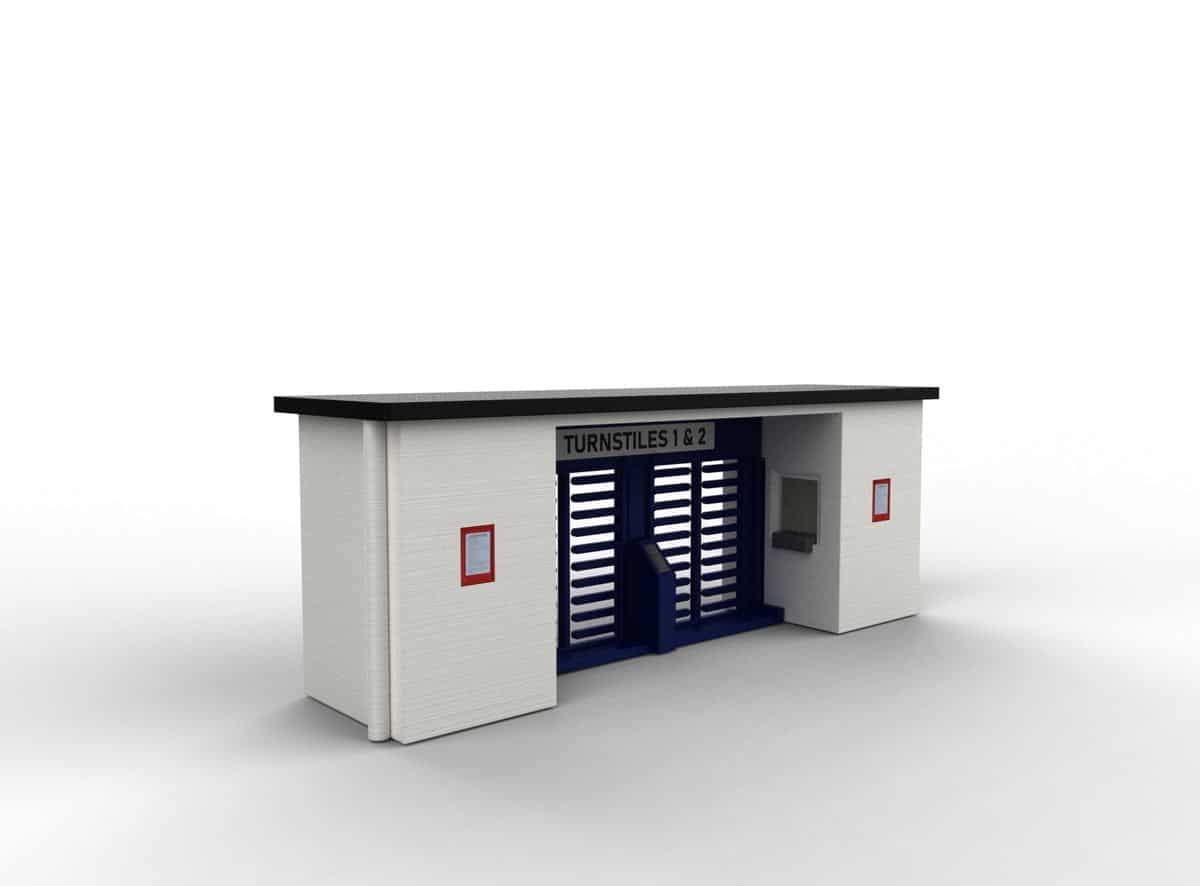 A finely detailed 3D-printed 1:76 scale stadium turnstile entrance.